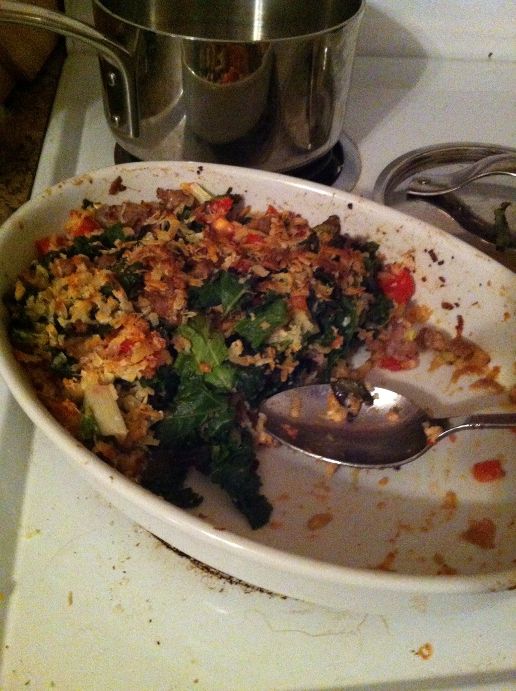 First, blanch the greens, shock them in some cold water, and wring them out. Cut the leaves into bite sized pieces. While those are cooking, brown up some sausage. Then cut up a tomato. Finally, mix the ingredients with some breadcrumbs and cheese in a casserole dish and pop into the oven at 350 until warmed through.